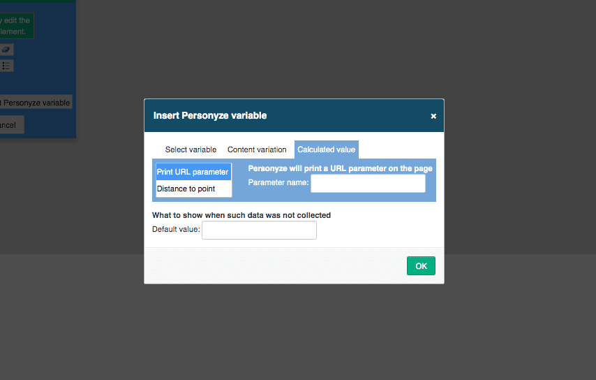 Alternatively, you can simply click the tab in the “Insert Personyze Variable” menu titled Calculated value, and print the value directly from the URL. This will not store the data in Personyze, but will only use the URL parameter for the current session.