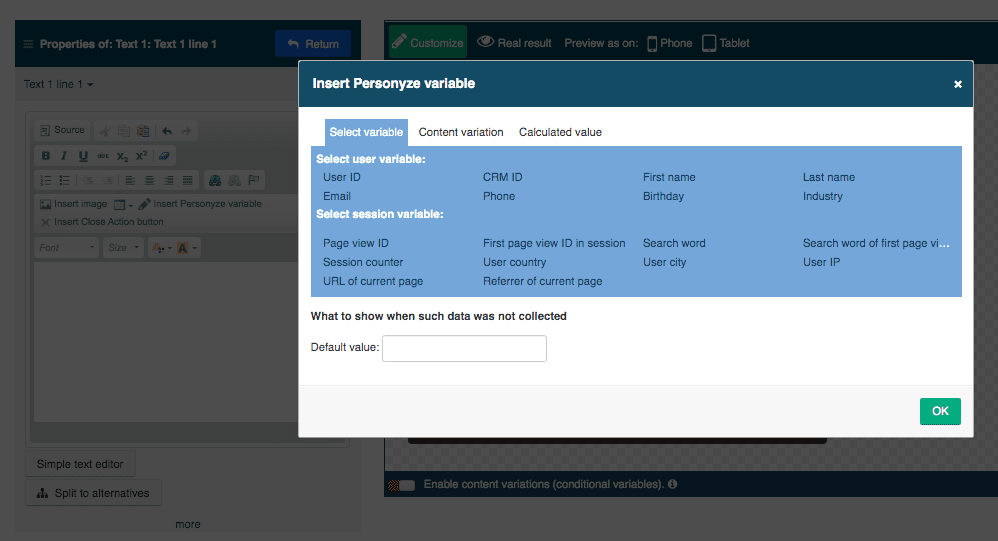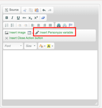 Every content widget in Personyze has the option to insert Personyze variables, when you use HTML editor or edit text. You can also set a default value, in case the variable you want to use for that individual isn’t present, but you still want to deploy the content.