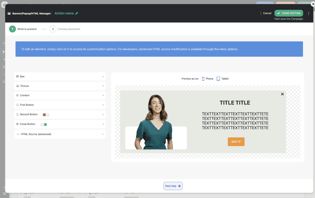 Personyze’s banner and popup editor empowers you to design and create highly personalized banners and popup windows, delivering targeted messages and marketing promotions. With a library of responsive templates to jumpstart your design process, and the ability to create and save your own custom templates, you have complete control. The user-friendly interface offers a wide range of customization features, including the option to directly edit CSS and HTML. You can also set your templates to inherit styling from your existing website style, ensuring consistent branding for elements like fonts and button styling, allowing you to seamlessly integrate your personalized messages and maximize engagement.