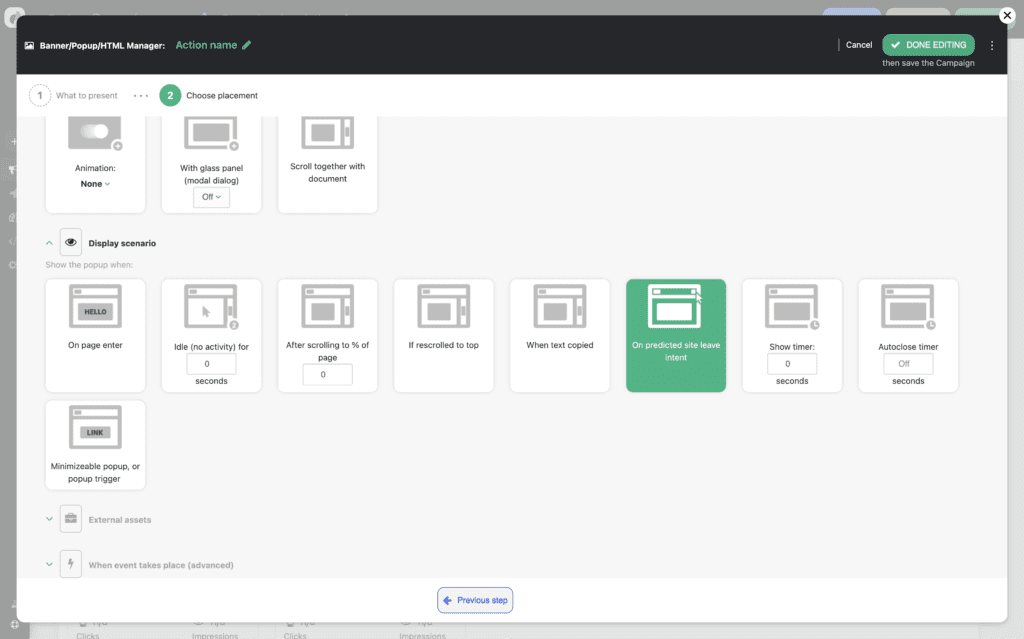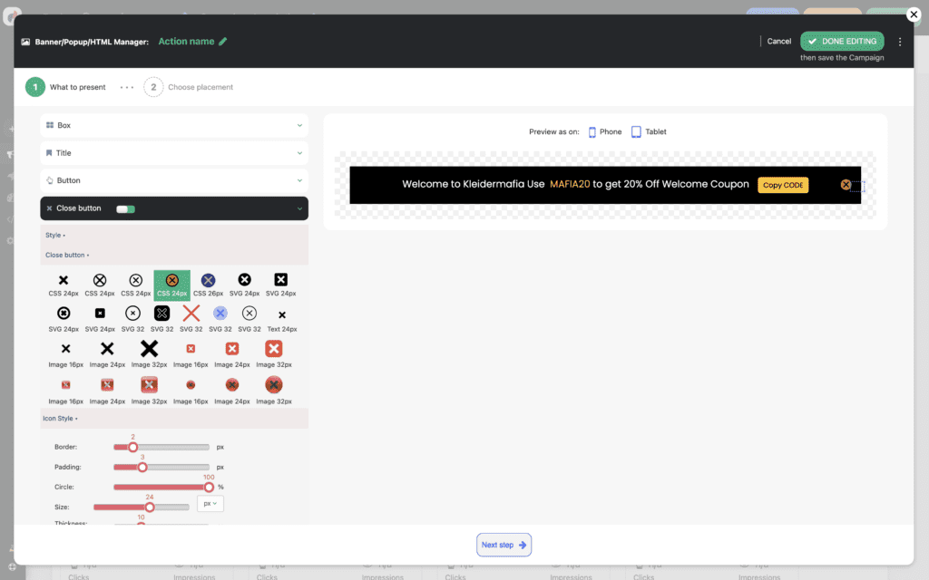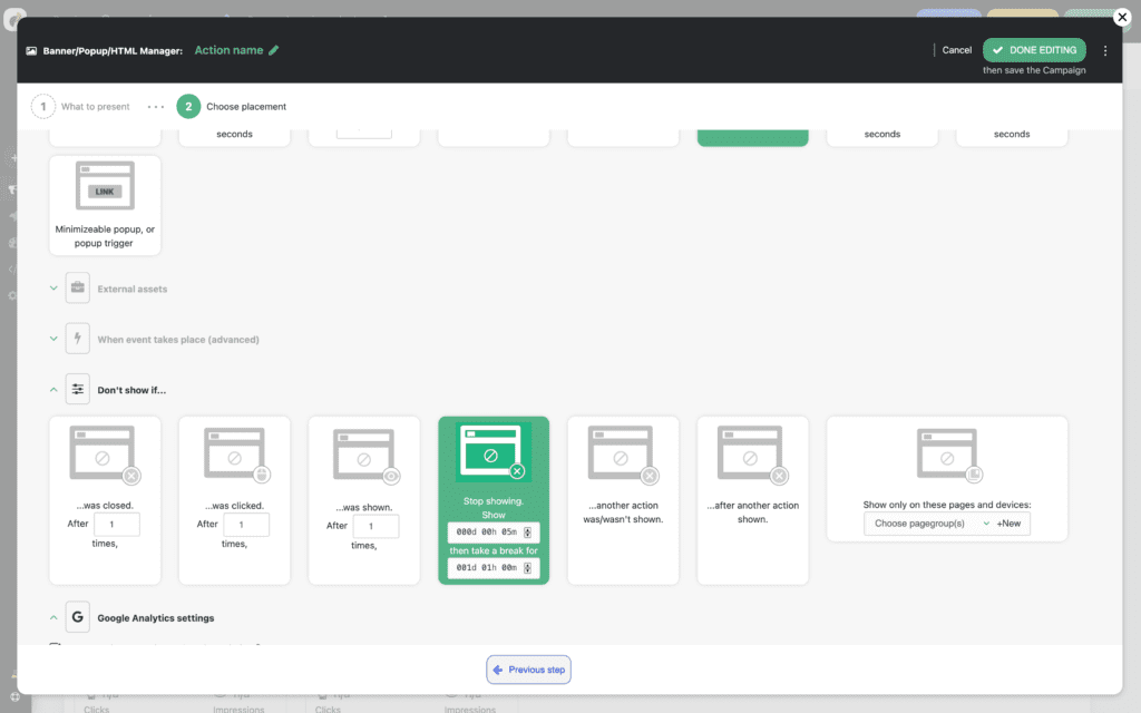 Any of the above can be displayed as banners or popups. Banners are embedded directly onto your page using our intuitive simulator – simply point and click to position them precisely where you want. Popups offer eight optional positions, including top and bottom bars, to maximize visibility. You gain full control over the timing of your displays, allowing you to optimize attention-grabbing moments while also managing frequency to prevent visitor annoyance.
