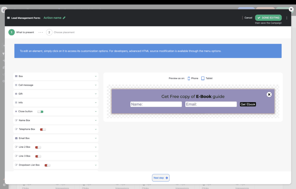 Lead capture forms, displayed as banners or popups, are a powerful tool for collecting leads and expanding your mailing list. You can easily add or remove fields and implement logic based on lead submission data. For example, if the company size exceeds 20 employees, you can trigger a webhook or send an email to a specific address. You can also prevent users from resubmitting the form if they’ve already done so in the past. Lead data can be integrated with platforms like HubSpot and Salesforce, among others. Additionally, you can download lead data as an Excel file and enrich it with session activity data from Personyze.”