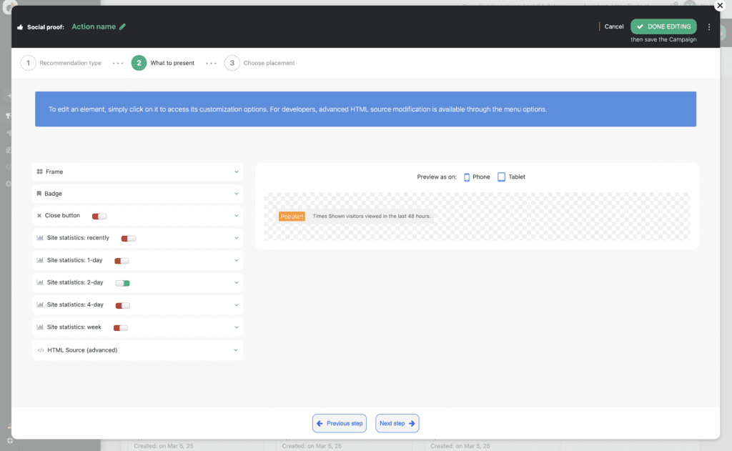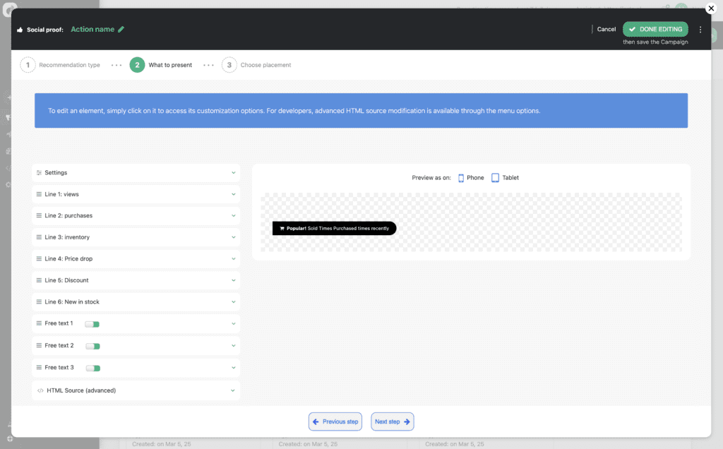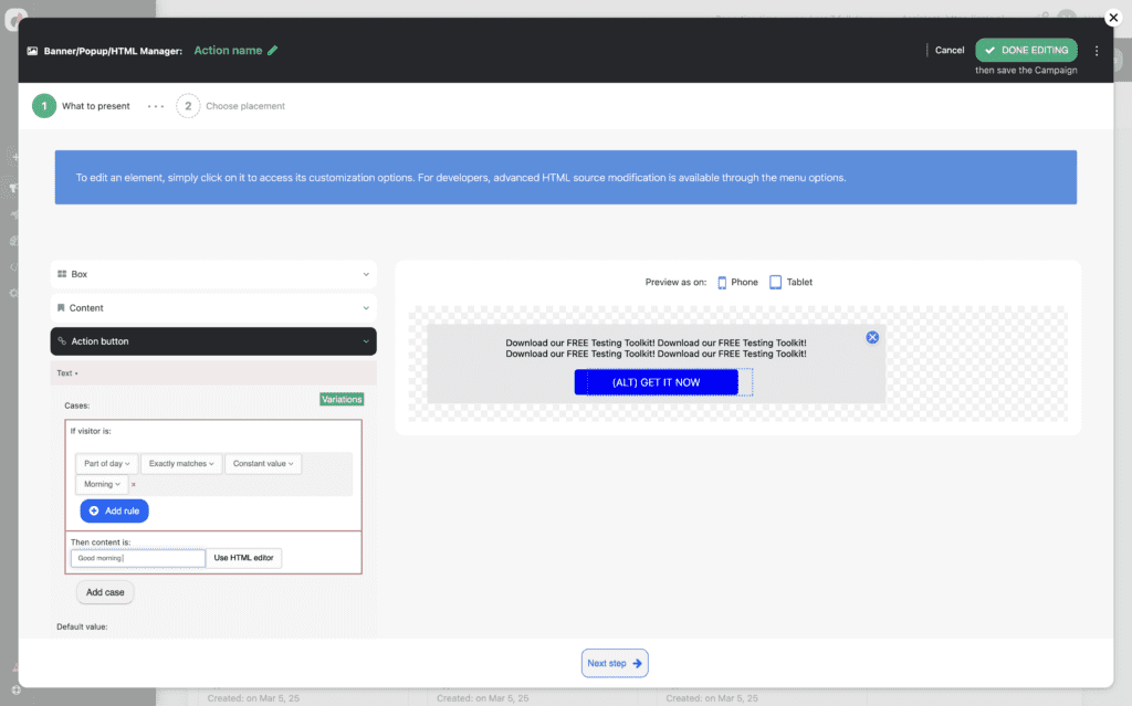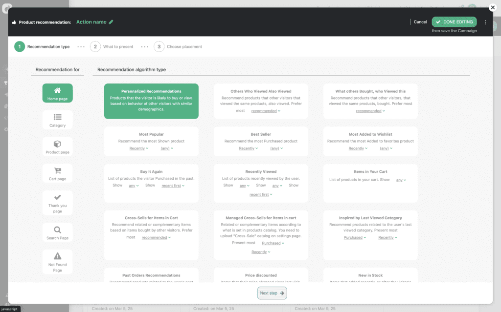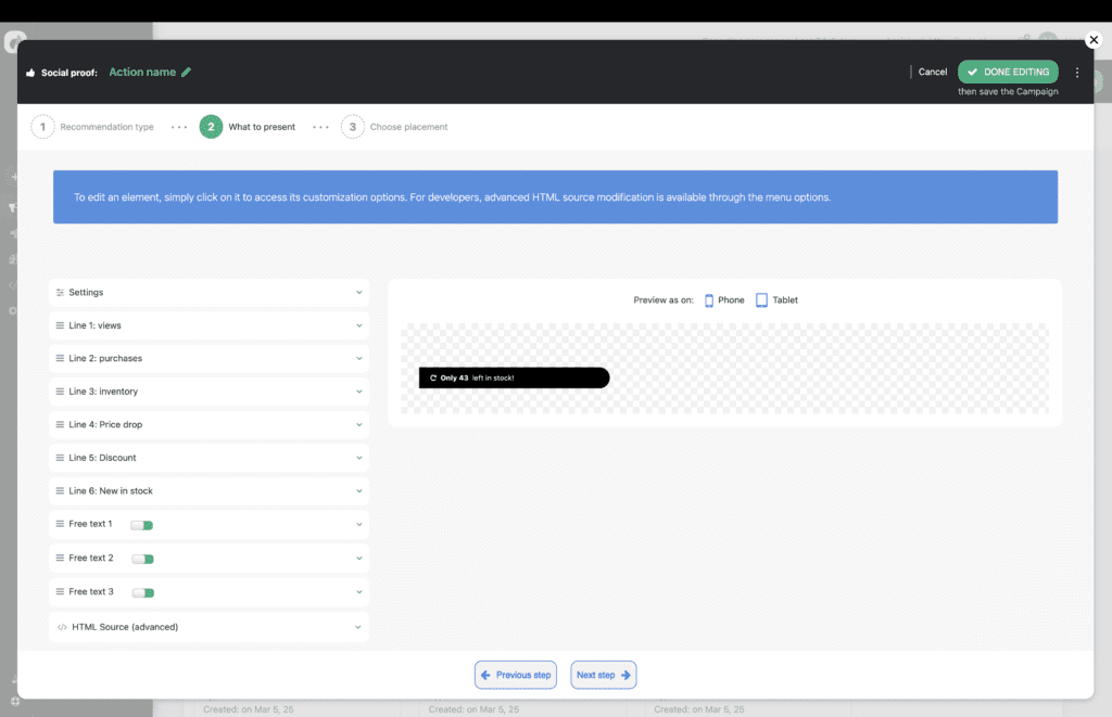 Embed our snippet in your site header—directly or via your tag manager—and start personalizing. Use step-by-step wizards and a no-code personalization toolbox to tailor every part of the customer journey.