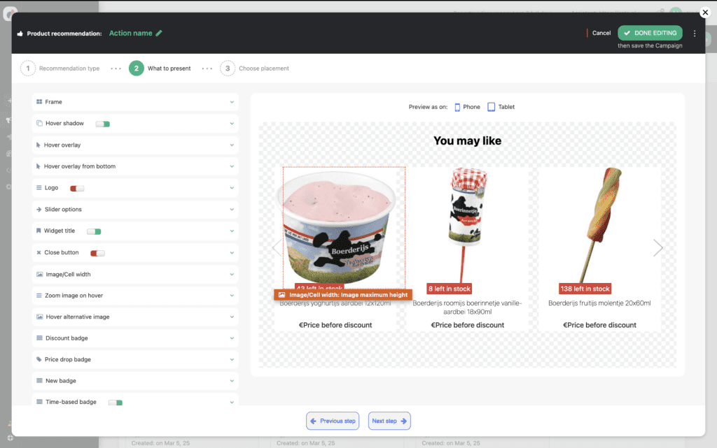 Display dynamic, AI-based product recommendations in popups or embedded directly into page content. Choose from numerous responsive templates, including dynamic options that highlight markdown discounts, popularity, days since arrival in the shop, and more.