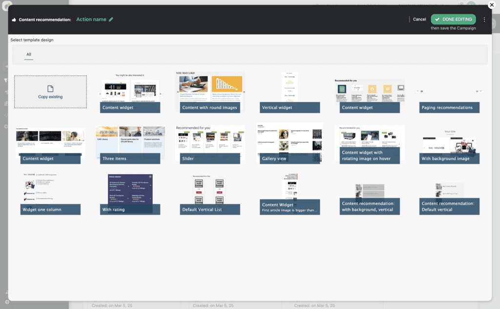 A complete list of the personalization tools included in our personalization platform, ranging from content widgets with eye-catching templates designed to help you create powerful, personalized messages and experiences across channels, to A/B testing and a performance dashboard. These tools work together seamlessly to drive engagement and maximize conversions.