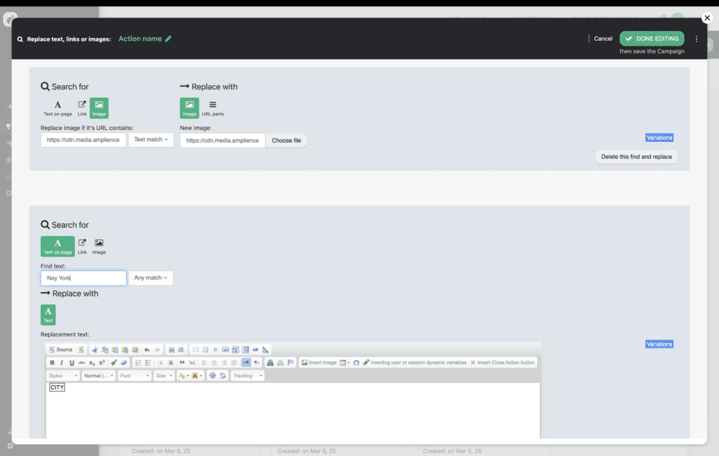 Find and replace text, images, or links with custom or dynamic content. For example, search for instances of ‘city’ and replace them with the visitor’s city name.