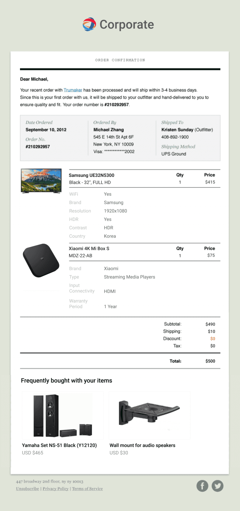 Recommendations can be added to any email, and we recommend using them as often as possible. Here are some examples of how recommendations can be added to routine email transactions, such as purchase verification emails.
