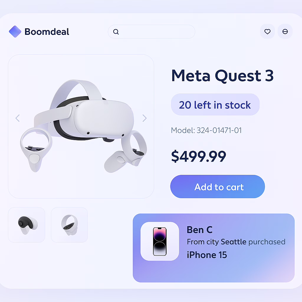 - Low-stock & demand cues: items left, views right now, added-to-cart count.